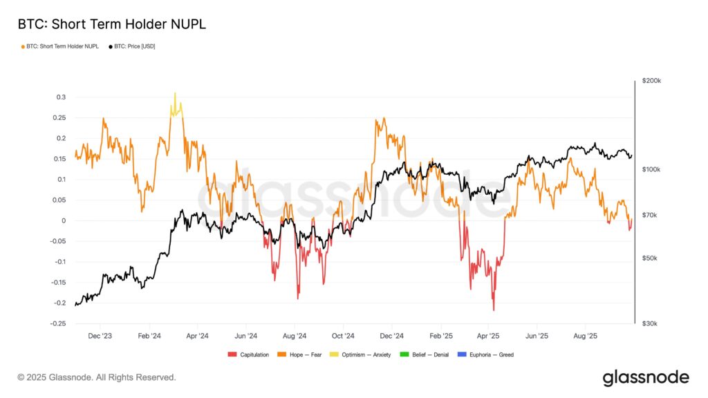[2]👉 glassnode 9.29发帖:BTC短期持有者NUPL指标已进入亏损区间,显示近期买家承压。从历史数据看,短期持有者投降事件往往标志着市场重置阶段,常为新一轮筹码积累奠定基础。