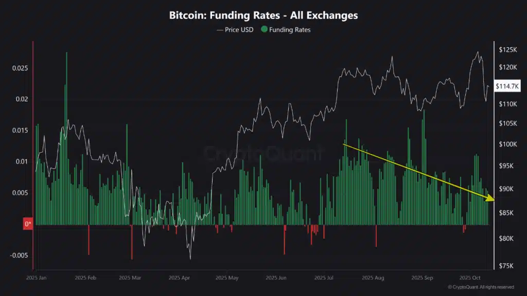 持续数月缓降的资金费率在周五市场恐慌期间一度转为负值。尽管出现回落,费率目前已稳定在微幅正值区间,显示市场情绪部分回归正常。
