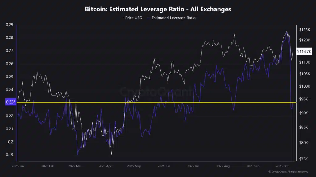 BTC预估杠杆率(ELR)在触及2022年以来高点后显著回落,该指标通过交易员使用杠杆与交易所储备的比率衡量市场风险,此次下降表明衍生品市场正在全面去杠杆。