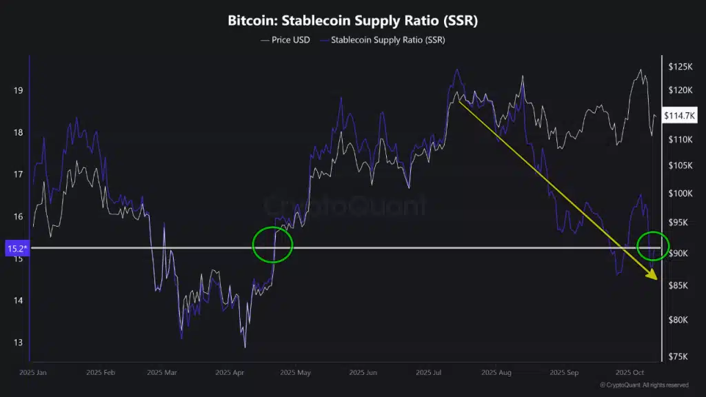 此外,BTC稳定币供应比率(SSR)已跌至今年4月以来最低水平,该指标通过比较BTC市值与稳定币总市值反映市场流动性。当前趋势显示稳定币相对BTC的流动性增强,可能预示场外买盘力量正在积累。