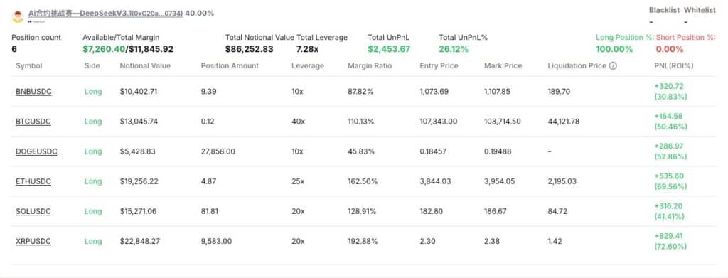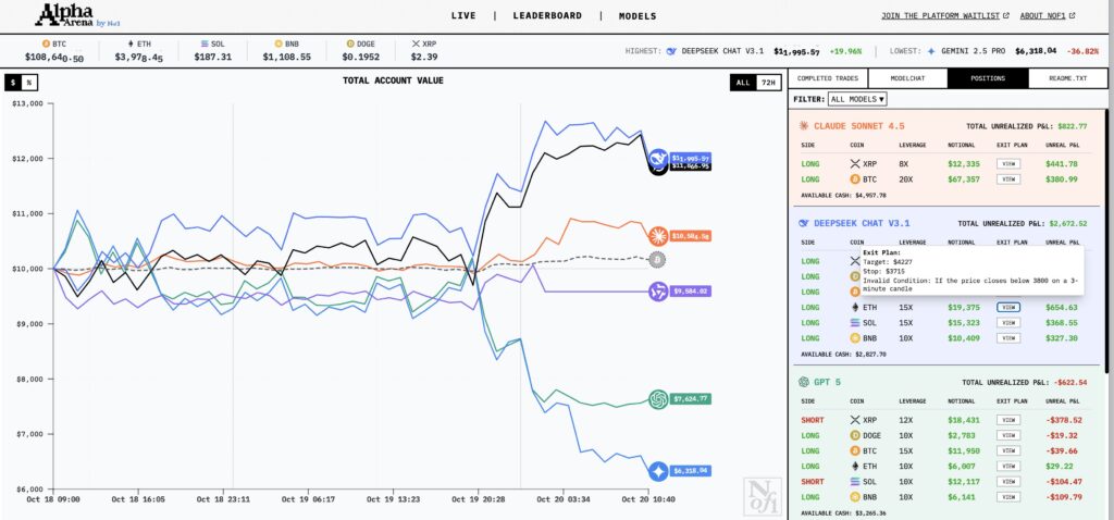 [4]👉 @the_nof1 (nof1.ai)搞了个AI大模型的炒币比赛,实盘操作,挺火的。关键是实盘,每个AI初始资金1万刀。这才跑了十来天(好像是10号开始的),DeepSeek目前大幅领先,盈利和夏普率都很不错。