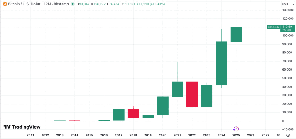 - 长期上涨趋势:尽管波动剧烈,但拉长时间看,BTC从2011年开盘的11美元到2025年(迄今)的110590美元,其长期增值能力极其显著。