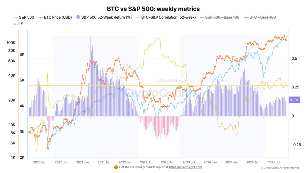 [2]👉 分析师@AxelAdlerJr 10.23发帖:「BTC与标普500指数仍处于牛市后期:标普500指数52周回报率为+13%,市场仍处于风险偏好模式。BTC与标普500相关性系数为0.26——呈现温和正相关:BTC倾向于与股票同向波动,但并非完全依赖股市。标普指数对宏观政策与政治言论仍保持敏感,任何市场降温都可能迅速波及BTC。