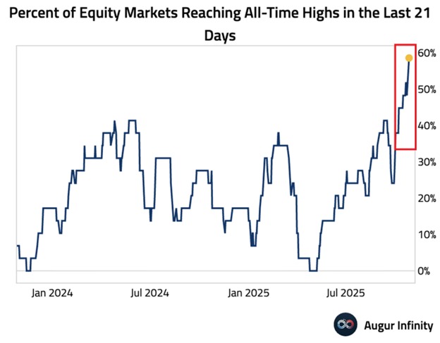 [4]👉 @KobeissiLetter 10.29发帖:全球牛市正在加速: 过去21天内,约60%的全球股票市场触及历史新高,为至少两年来最高比例。这一数字在最近几周内实现翻倍。 美国、加拿大、日本、英国和德国等主要市场均创下新纪录。仅标普500指数今年就已37次刷新历史高点,成为自2017年以来第三长的连涨周期,仅次于2024年的57次和2021年的70次纪录。 全球上涨行情已全面展开。