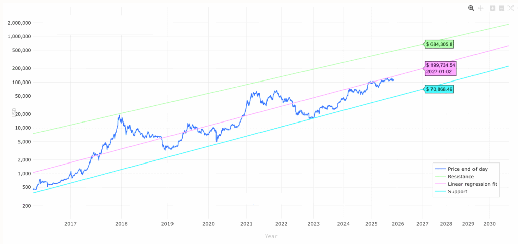 如果2026转熊一年,还是年底筑底,那么可能性较大的底部是幂律下轨的70k,而如果深探到某些人期待的5万刀,恐怕就要刺穿下轨,其概率就要大大减小了。