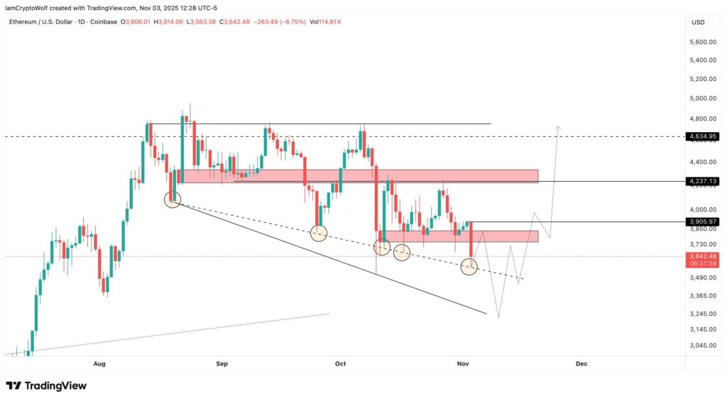 [4]👉 分析师@IamCryptoWolf 11.4发帖:我的基本预测是:我们正进入始于8月的这轮调整的最后阶段,而这只是更大周期(始于1500美元区间)的一部分。我仍预计价格会下探3400美元区间……除非以太坊(ETH)能重新站稳3900美元上方。