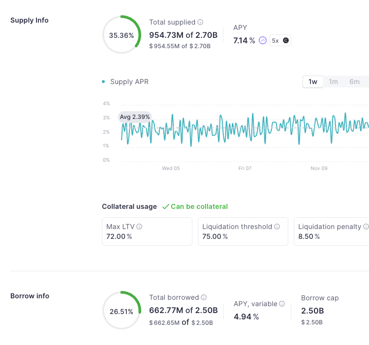 如果存USDC(5%)借PYUSD(3.39%)复存(8.15%),Max LTV 75%,复合APY可以到 (5% + 75% * 4.76%) = 8.57%。