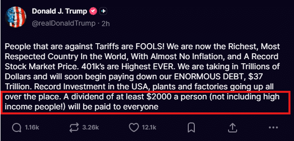 [3]👉 川普11.9发帖称,要给每个美国人(除了高收入人群)发放2000美刀“分红”,这来自于关税政策带来的收入!