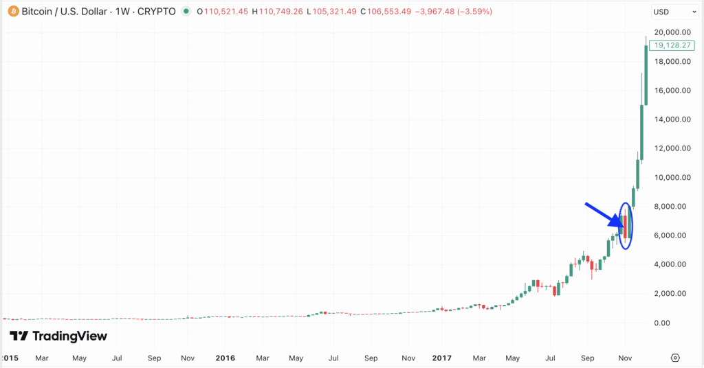 再叠加本周(2025w45)美国政府可能重开。BTC果真要像2017的图那样,11月初一根周阴线,然后中旬启动尾部拉升吗??