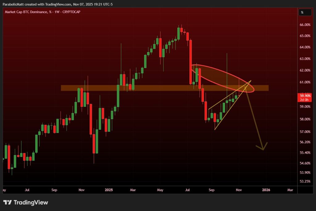 [5]👉 分析师@MatthewHyland_ 11.8发帖称:看好山寨币走势的理由在于:BTC统治力图表已连续数周呈现疲软态势。这种下跌趋势大概率将持续,近期出现的反弹不过是下跌通道中的死猫反弹。