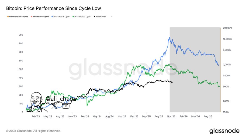 [4]👉 分析师@ali_charts 11.12发帖:若本次BTC行情周期与2015-2018或2018-2022周期走势相似,则价格峰值已于10月26日出现,宏观下行趋势或已悄然开启。