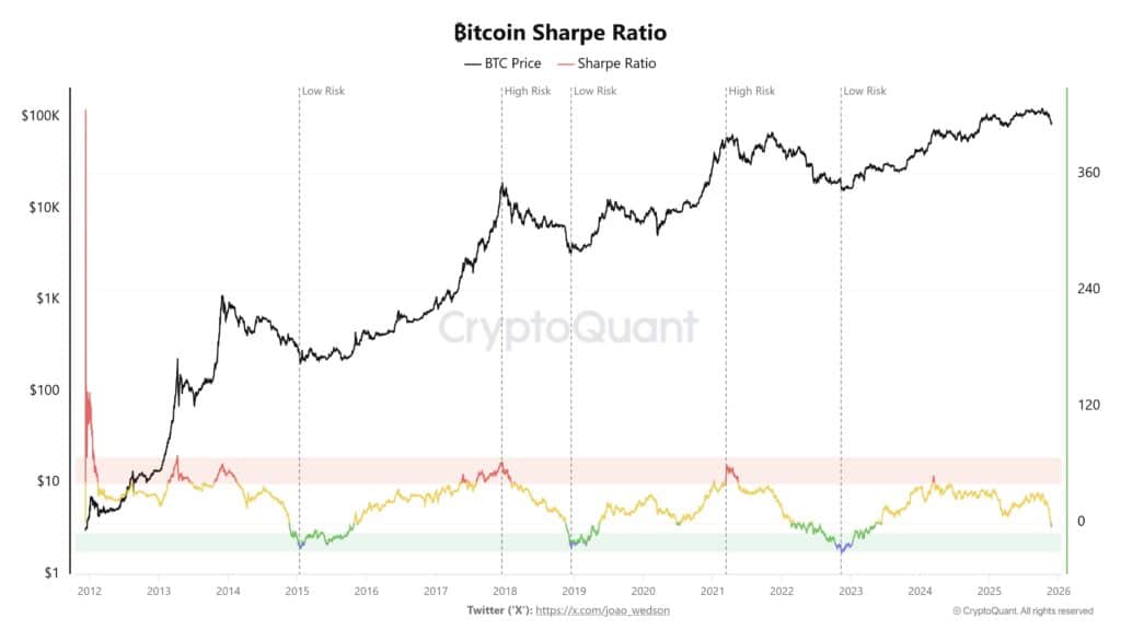[1]👉 @coinbureau 11.25发帖:罕见底部信号闪现! BTC 的夏普比率已暴跌至零值区域,这一水平曾出现在2019年、2020年和2022年重大行情逆转前。