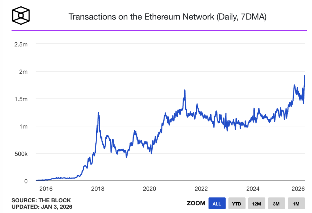 [9]👉 以太坊网络活跃度在2025年末创下历史新高,其单日交易量于12月31日达到187万笔,超越了2021年NFT与DeFi热潮时期及2025年8月的峰值。与此同时,活跃地址数量攀升至72.8万,为2021年5月以来最高水平;单日新增地址数亦创下2018年初以来的纪录。分析指出,这一波增长主要得益于年内两次重大升级——Pectra与Fusaka,它们通过提升吞吐量、引入账户抽象、优化数据可用性采样等方式大幅降低了手续费并增强了网络可扩展性。此外,机构通过ETF及现实资产代币化参与度的提高也推动了生态活跃。尽管面临竞争,以太坊在稳定币、现实资产代币化、质押协议乃至游戏与NFT等领域仍占据主导地位。分析师认为,在市场因价格平淡而缺乏关注之际,以太坊可能正为下一次大规模价值发现奠定基础。网络预计在2026年还将迎来Glamsterdam与Hegota两次重要升级,以进一步提升性能与去中心化程度。(theblock 1.2报道)