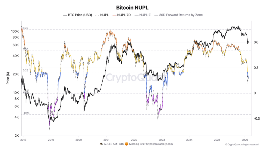 然而,另一个反映市场心理的关键指标——NUPL,却显示出完全不同的图景。NUPL当前值为0.197,处于希望区间,远未进入真正投降时所对应的净亏损状态(即NUPL为负值)。2018年底、2020年3月和2022年底的底部,NUPL都曾跌入负值区[9]。Axel Adler Jr.解释说,这意味着大多数参与者仍处于盈利状态(尽管利润微薄),但信念已经消退。这是一个心理上的衰弱阶段,而非恐慌性的投降阶段[9]。