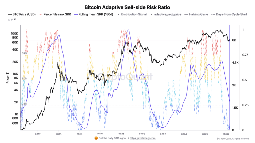 独立分析师Axel Adler Jr. 的最新研报揭示了一个令人震惊的事实:市场的卖方压力已经降至冰点。他追踪的BTC适应性卖方风险比率(Adaptive Sell-side Risk Ratio)显示,上一次活跃的卖方压力信号还要追溯到2024年12月(10.7万美刀高点),此后该信号便再未出现[7]。