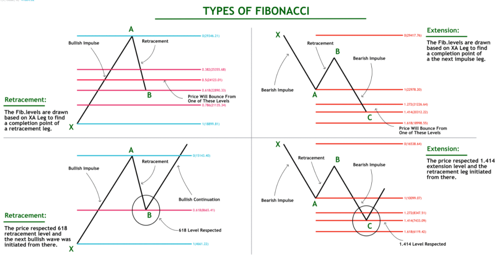 从起点X到第一波高点/低点的A点之后,使用斐波那契回撤画出了回撤/反弹的位置B点。