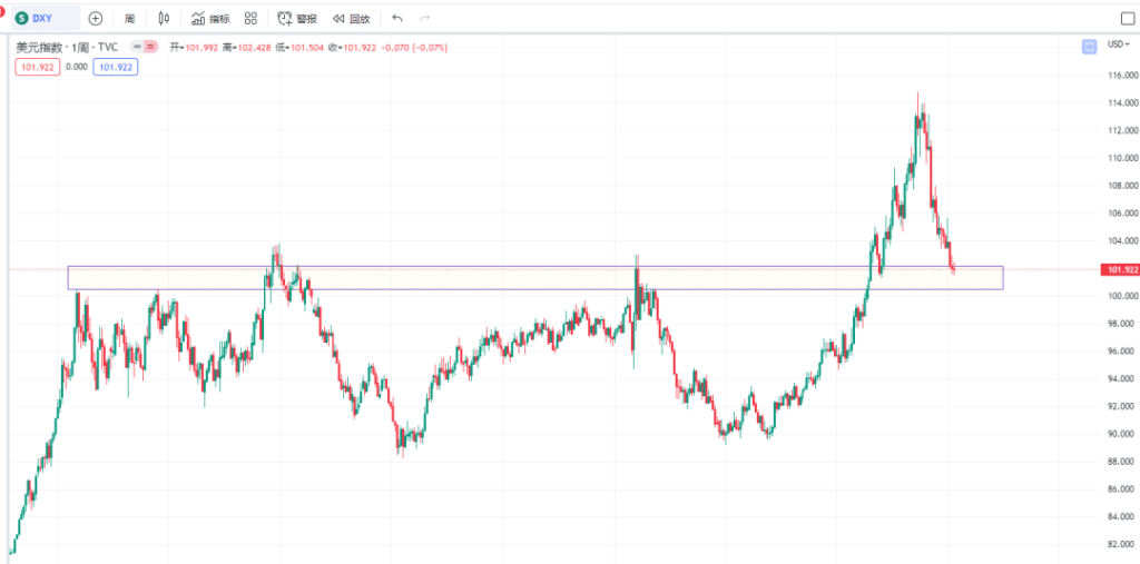 从上方图中我们可以看出,当下美元指数周线图依旧是处于单边下跌的状态。但已经来到了一个关键的结构位置。我们需要注意的是此时美元指数是否会反扑。